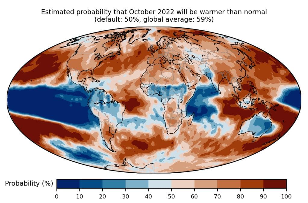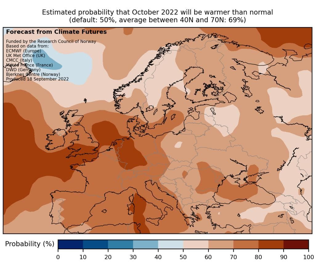 Bildet under viser beregnet sannsynlighet for at oktober blir varmere enn normalt, der «normalen» er gjennomsnittet av alle oktobermånedene mellom 1993 og 2021. De røde fargene viser områder der mer enn halvparten av de 293 scenarioene er varmere enn normalt.