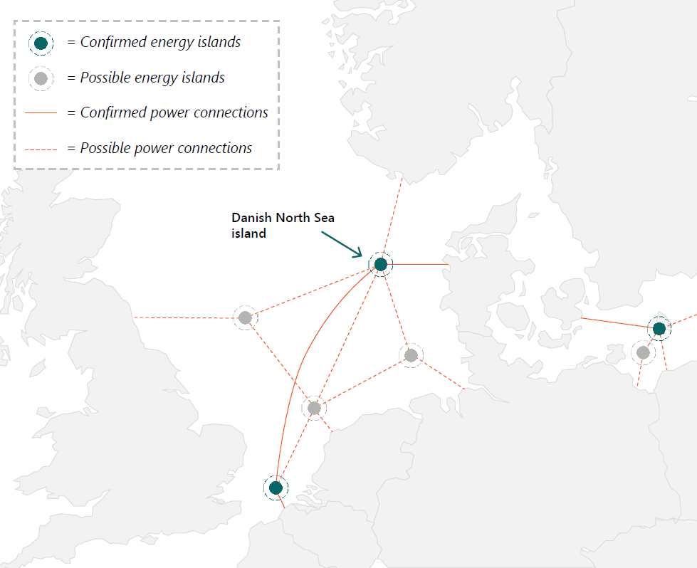 I 2021 ble danske politikere ble enige om å bygge en kunstig energiøy 80 kilometer vest for Jyllland i Nordsjøen. Havdypet der den skal bygges, er mellom 20 og 30 meter. Den vil være mellom 42 og 50 hektar stor. Det tilsvarer et areal som 70-80 fotballbaner.