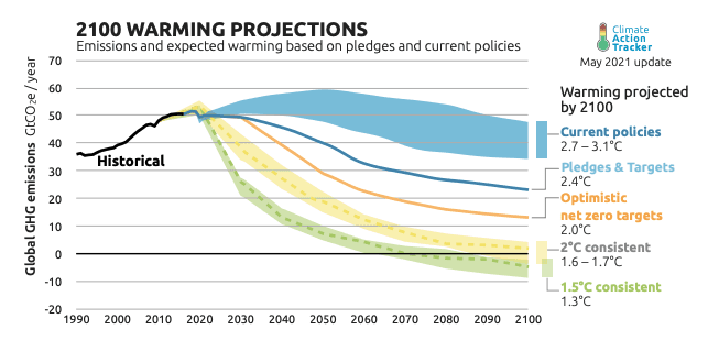Skulle alle annonserte visjoner om netto nullutslipp i 2050 slå til, er det 50/50-sjanse for at temperaturstigningen kan være så lav som 2 grader. Til nå har land som står for 73 prosent av globale utslipp, lovet å nå netto null innen 2050.
