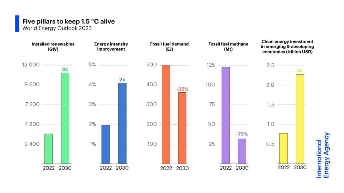 Fem tiltak fra IEA:Det internasjonale energibyrået (IEA) la denne uken frem sin årlige analyse World Energy Outlook – med innspill til COP28. Fem hovedtiltak kan få verden på sporet av målene i Paris-avtalen, mener organisasjonen (se figur). Les mer i pressemeldingen fra IEA.