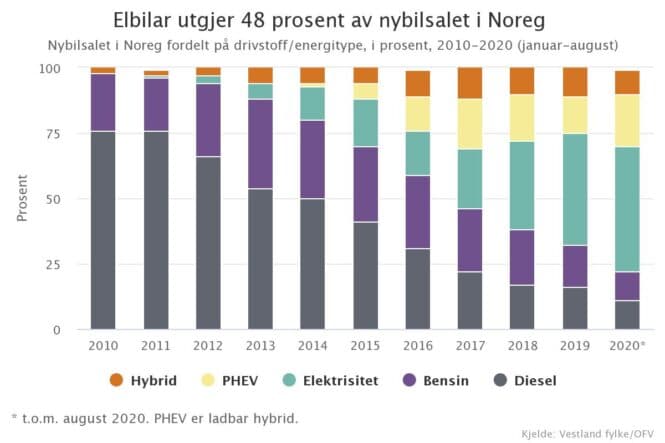 Vi startar med Noreg der det blei selt 10 802 nye personbilar i august – 1271 færre køyretøy enn i same månad i fjor. Elbilar stod for 52,8 prosent av nybilsalet – opp frå 39 prosent i august 2019.