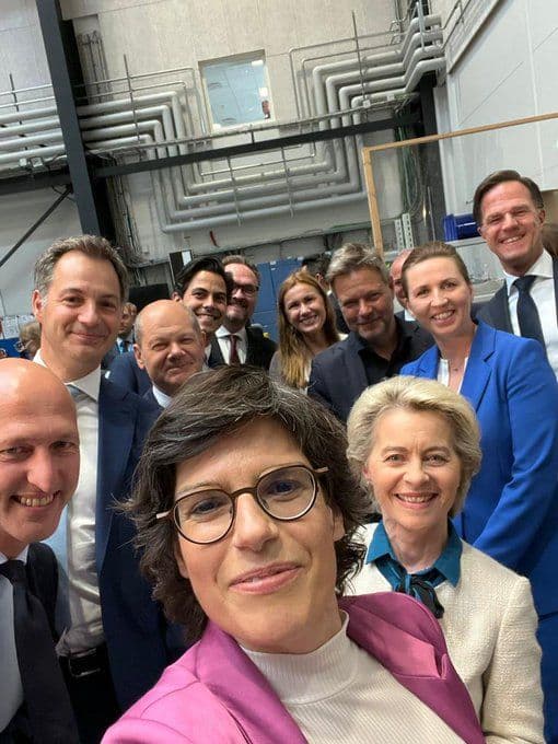 Bakgrunn: Regjeringssjefene og ministre fra Danmark, Nederland, Belgia og Tyskland, samt EU-kommisjonens president, smiler på selfien som Belgias energiminister Tinne Van der Straeten la ut etter Esbjerg-møtet - noen timer etter at Repower EU-planen var lagt frem i Brussel.