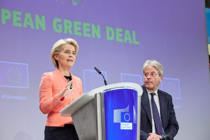 EU-kommisjonens president Ursula von der Leyen og kommissær Paolo Gentiloni under presentasjonen av klimapakken. (Foto: Claudio Centonze, EC Audiovisual Service)