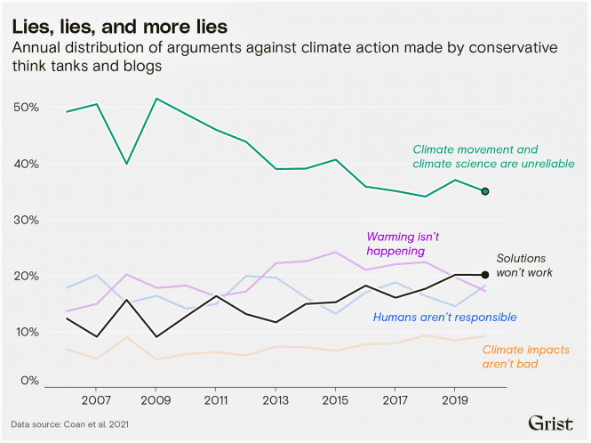 Så tar jeg med en sak om at klimafornektelse har gått av moten – men at erkemotstanderne av energiomstillingen nå snarere angriper selve klimaløsningene. Det kommer fram i en studie publisert i tidsskriftet Nature Scientific Reports – omtalt av Grist. Forskere har funnet ut at det i dag kun er 10 prosent av argumentene fra konservative tenketanker i USA som utfordrer den vitenskapelige konsensus om den globale oppvarmingen. De nye angrepspunktene nå er i stedet at foreslåtte klimaløsninger ikke vil fungere.