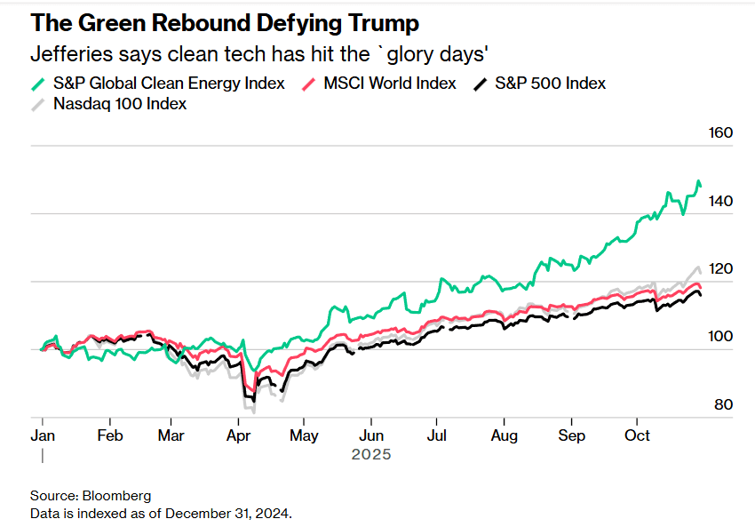 Tross president Donald Trumps angrep på vedtatt klimapolitikk, er grønne aksjer en av årets mest lukrative satsinger, skriver Bloomberg. S&P 500, aksjeindeksen over de 500 største amerikanske virksomhetene, viser en verdistigning på 50 prosent i år for grønne aksjer. (Graf fra Bloomberg under.)