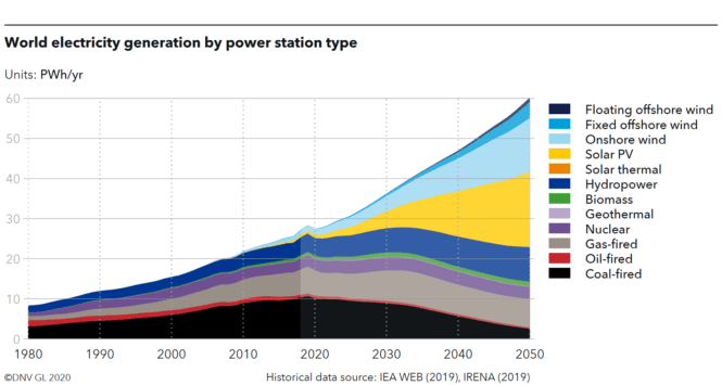 Vindkraft produsert fra flytende turbiner er så vidt kommet i gang, med Equinor som en av de ledende aktørene. I 2020-utgaven av DNV GLs "Energy Transition Outlook", en forskningsbasert fremskrivning av energiverdenen til 2050, fremheves flytende havvind som en av fornybarteknologiene der det forventes betydelig vekst: