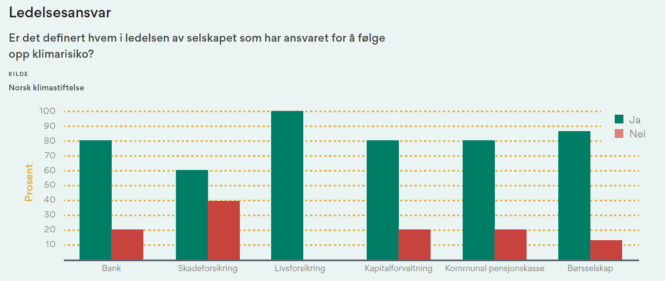 I kartleggingen ble det spurt om det er definert hvem i ledelsen som har ansvaret for å følge opp klimarisiko. 44 av 55 selskaper – 80 prosent – svarer bekreftende, mens resten svarer nei.