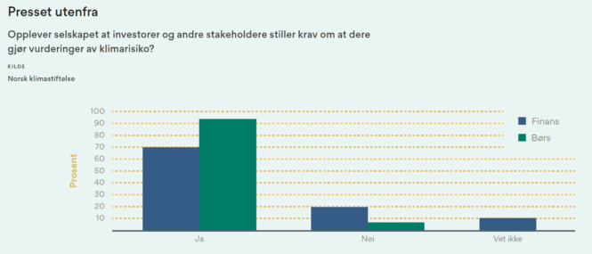 I Norsk klimastiftelses kartlegging melder 42 av 55 selskaper (76 prosent) at investorer eller andre interessenter stiller krav om at klimarisiko blir vurdert. «Ja, dette er et økende krav, særlig blant investorer», rapporterer et av selskapene.