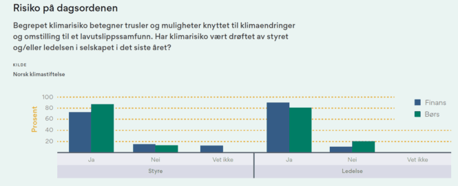 Kartleggingen søkte å fastslå det grunnleggende: Er klimarisiko et tema i selskapene? Svarene tyder på at klimarisiko har fått en plass på agendaen i mange av virksomhetene som er med i kartleggingen.