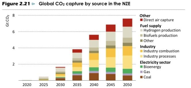 Karbonfangst, -lagring og -bruk (CCUS) blir viktig for flere deler av omstillingen, mener IEA. Blant disse er å fjerne utslipp fra noen av de vanskeligste sektorene som industri og transport, oppskalere hydrogenproduksjon og fjerne CO₂ fra atmosfæren gjennom karbonfangst fra luft og bioenergi med karbonlagring.
