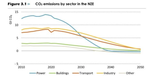 Slik ser IEA for seg utslippsutviklingen i de ulike hovedsektorene i økonomien. Kraftsektoren er utslippsfri i 2040. I industri og transport faller utslippene 20 prosent til 2030 og 90 prosent til 2050.