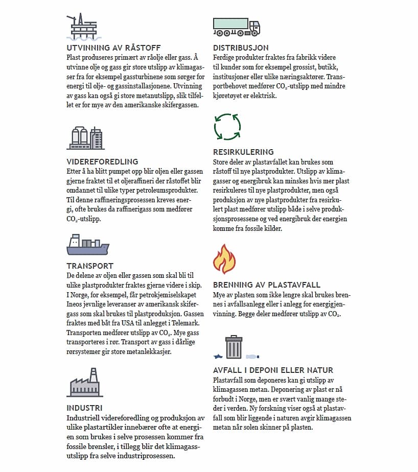 Mange steder i verden bygges det nye anlegg for ny plastproduksjon, store anlegg er på tegnebrettet – det investeres mye og hurtig for at forbruket av ny plast skal skyte fart, ikke synke. Det betyr også økte klimagassutslipp. Utslipp av klimagasser kommer mange steder i plastens verdikjede. De aller største fotavtrykkene oppstår når plasten blir til avfall og brennes.