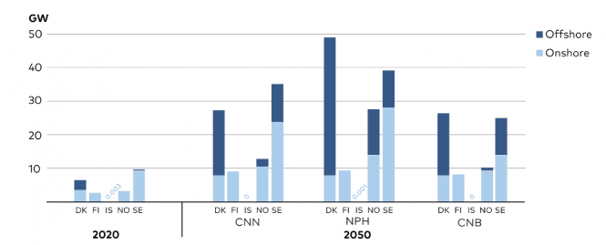 I alle scenarioene forutsettes det atskillig større vindkraftutbygging i Sverige og Danmark enn i Norge mot 2050 - se figur: