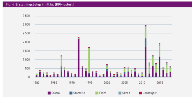 De siste 11 årene har forsikringsselskapene betalt ut om lag 30 milliarder kroner i erstatning til privatpersoner og næringslivet som har fått skade på bygninger og innbo på grunn av naturhendelser eller værrelaterte hendelser.