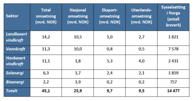 Landbasert vindkraft er den største næringen og hadde i tillegg sterkest vekst, med en total omsetning på 14,2 milliarder kroner i 2019. På plassene bak fulgte vannkraft og havvind med ca 11 milliarder hver, med et lite sprang ned til solenergi med 6,3 milliarder og bioenergi med 2,2 milliarder i omsetning. I antall arbeidsplasser står vannkraften for ca 50 prosent, med 7587 av 14 477 årsverk i Norge. Analysen inkluderer ikke omsetning knyttet til produksjon og salg av kraft, eller drift av kraftnett.