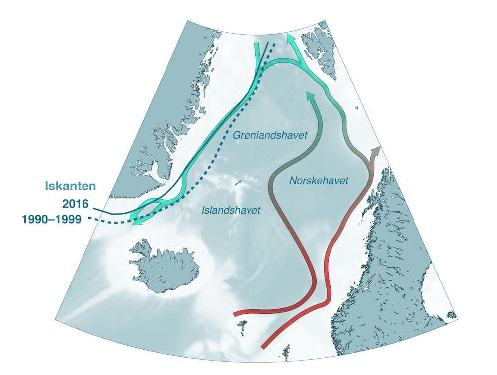 De store havstrømmene på jorden er med på å fordele varme fra varme områder rundt ekvator til kaldere områder rundt polene. I Atlanterhavet strømmer vannet nordover i overflaten; i Golfstrømmen og videre nordover mellom Færøyene og Skottland, inn i Norskehavet og oppover langs norskekysten. Etter hvert som vannet blir kaldere, blir det tyngre og synker. Så strømmer det sørover langs østkysten av Grønland og ut gjennom stredet mellom Island og Grønland mot dypet av Atlanterhavet.