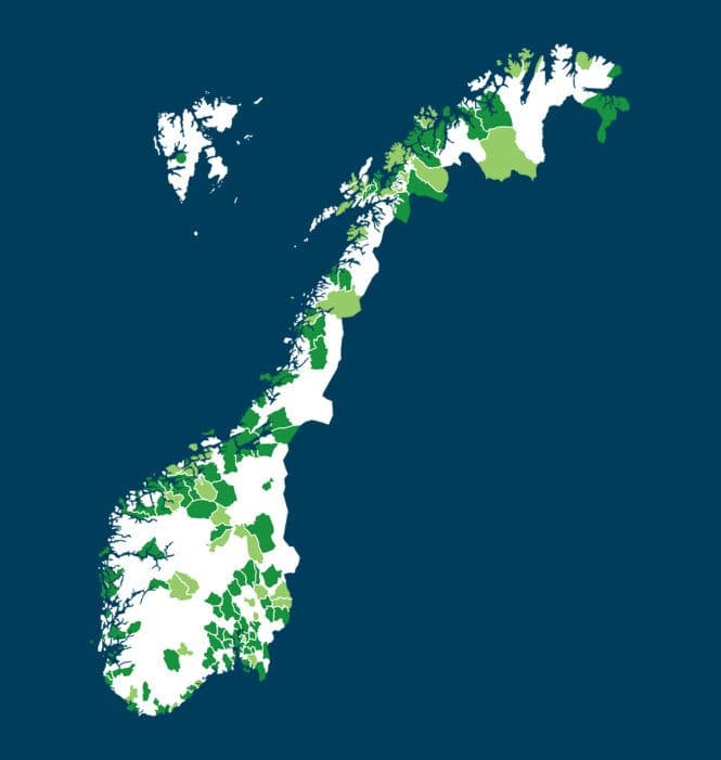Vi har merket en markant økning i etterspørsel etter grønne lån. I kartet over kan dere se i hvilke kommuner vi finansierer klimavennlige prosjekter, og dette kartet blir stadig grønnere. Ved å finansiere deres klimavennlige prosjekter, vil også deres kommune markeres med grønn farge på dette kartet – målet er at hele norgeskartet skal bli grønt!