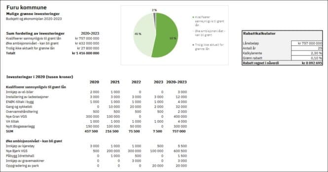 Vi vet også at premissene for kommunens investeringer ofte legges før prosjektet kommer inn i investeringsbudsjettet. Vi ser gjerne på hvilke grep dere kan gjøre med framtidige investeringer for at de kan kvalifisere til grønn finansiering.