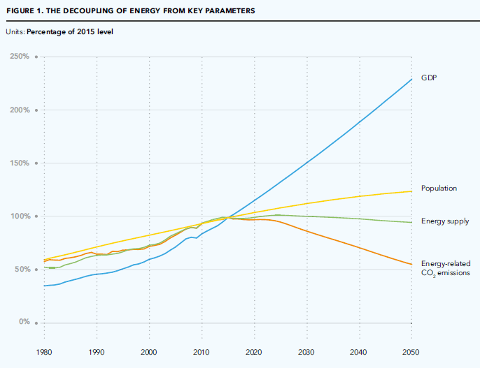 The slower population growth, slower economic growth, and stronger declines in energy intensity leads to flattening in energy demand after 2030, and due to a shift to renewable energy sources, a drop in CO2emissions.