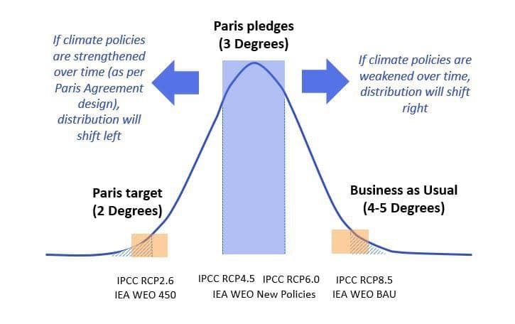 Keeping global warming below 2°C is not likely based on current emission pledges. Investors should consider various scenarios, including scenarios leading to high-end catastrophic changes and low-end scenarios requiring ambitious policies and high transitional risk.