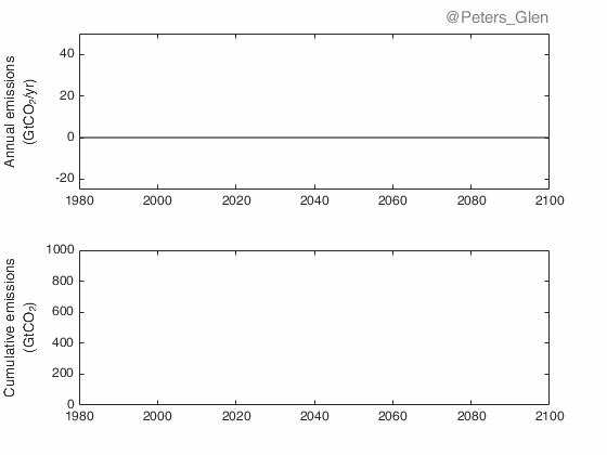 The avoidance carbon budget is a little arbitrary to define, and I have integrated all the way to 2100 when the scenario ends, as done in Rogelj et al. The avoidance carbon budgets are much smaller as they bring in the negative emissions required to stay «below 1.5°C» (green in the above figures). The avoidance carbon budget gets smaller over time as long as emissions remain net negative. If you wait long enough, we can technically cool the planet below pre-industrial levels…