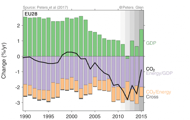 The emission reductions in Europe have many parallels with the reductions in the USA. The lower emissions growth (black line) is driven by lower economic growth since the global financial crisis (green), and continual improvements in energy intensity (purple) and carbon intensity (orange).