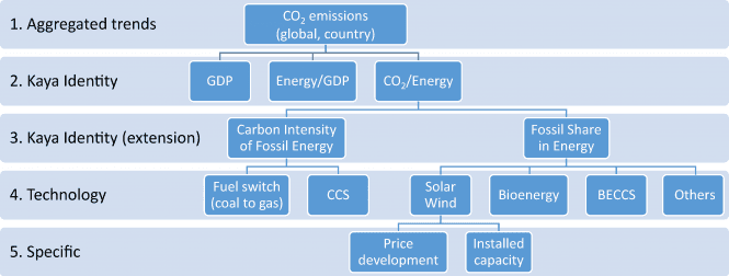 We first focus on the key overarching variables, and then gradually “zoom in” to get more detail on specific factors. This makes it easier to separate out interactions and focus on the main factors influencing emissions, which may vary by country.