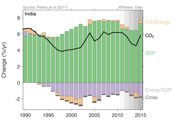 Because of the strong growth in economic activity, much larger than improvements in the emission intensity, it is expected that India’s emissions will grow strongly in the next decades.