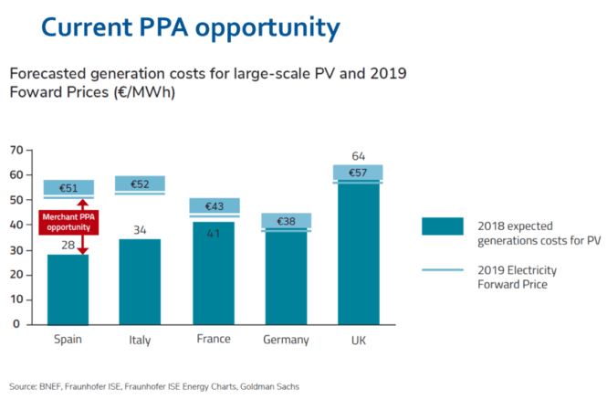 Spain is an outstanding example of the revival of the solar business in Europe. Since the "solar bubble" exploded about 10 years ago, the country has on average installed no more than 100-200 MW solar PV per year. UNEF, Spain’s PV industry association, projects a yearly growth of 3,000 MW (3 GW) of solar PV over the next years, increasing total installed capacity from 5 in 2018 to 42 GW in 2030. This is more or less what the Spanish government and the solar industry reckon will be required to meet the national targets of 74% renewable share of the country’s electricity mix by 2030.