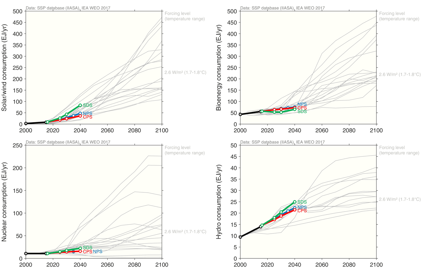 The WEO has relatively low bioenergy consumption, and it is lowest in the Sustainable Development Scenario. This is in stark contrast to most other 2°C scenarios, which are based on high levels of bioenergy, particularly after 2050 and particularly when linked to carbon capture and storage. Nuclear and Hydro consumption vary little by scenario, though, some 2°C scenarios have particularly high levels of nuclear.