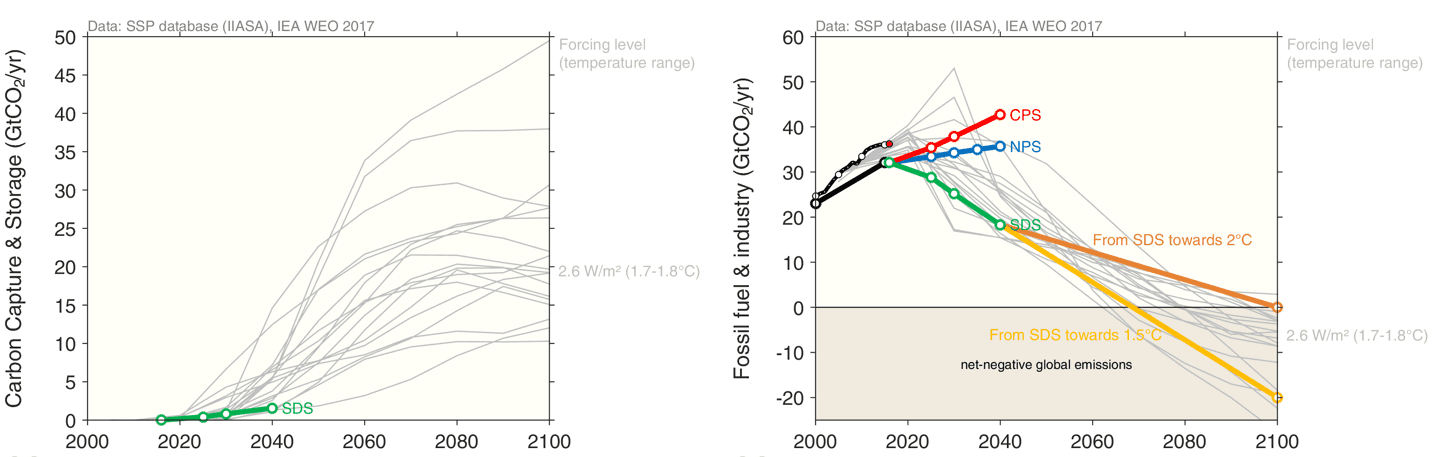 Beyond 2040, the Sustainable Development Scenario diverges into two pathways. One consistent with 2°C, reaching net-zero emissions in 2100, and one towards 1.5°C, reaching about -20GtCO₂/yr by 2100 requiring large-scale carbon dioxide removal. The WEO does not explore pathways beyond 2040, so it is not known how 1.5°C-2°C would be met, and what the implications are for bioenergy and carbon capture and storage, and carbon dioxide removal more broadly.