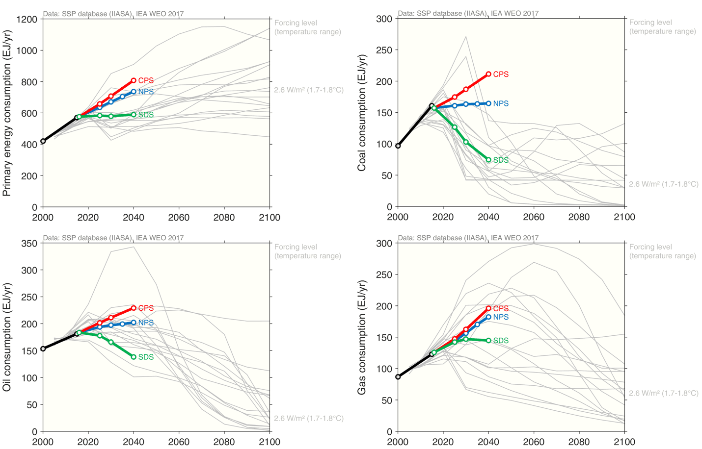 If the IEA WEO scenarios get a hard time, then who does better? From a climate perspective, one would obviously look at the scenarios assessed by the IPCC. The research community has now developed a new set of scenarios, called the Shared Socioeconomic Pathways (SSPs), that will frame climate policy discussions for the next decade, or more, and feed into the next IPCC assessment reports.