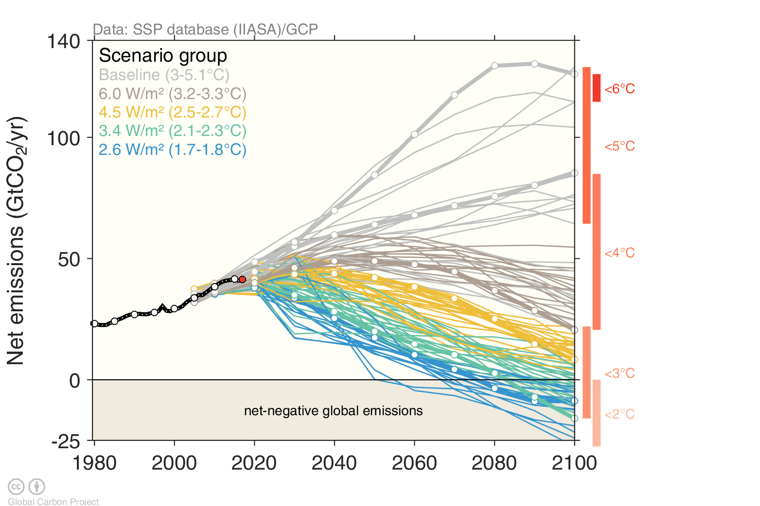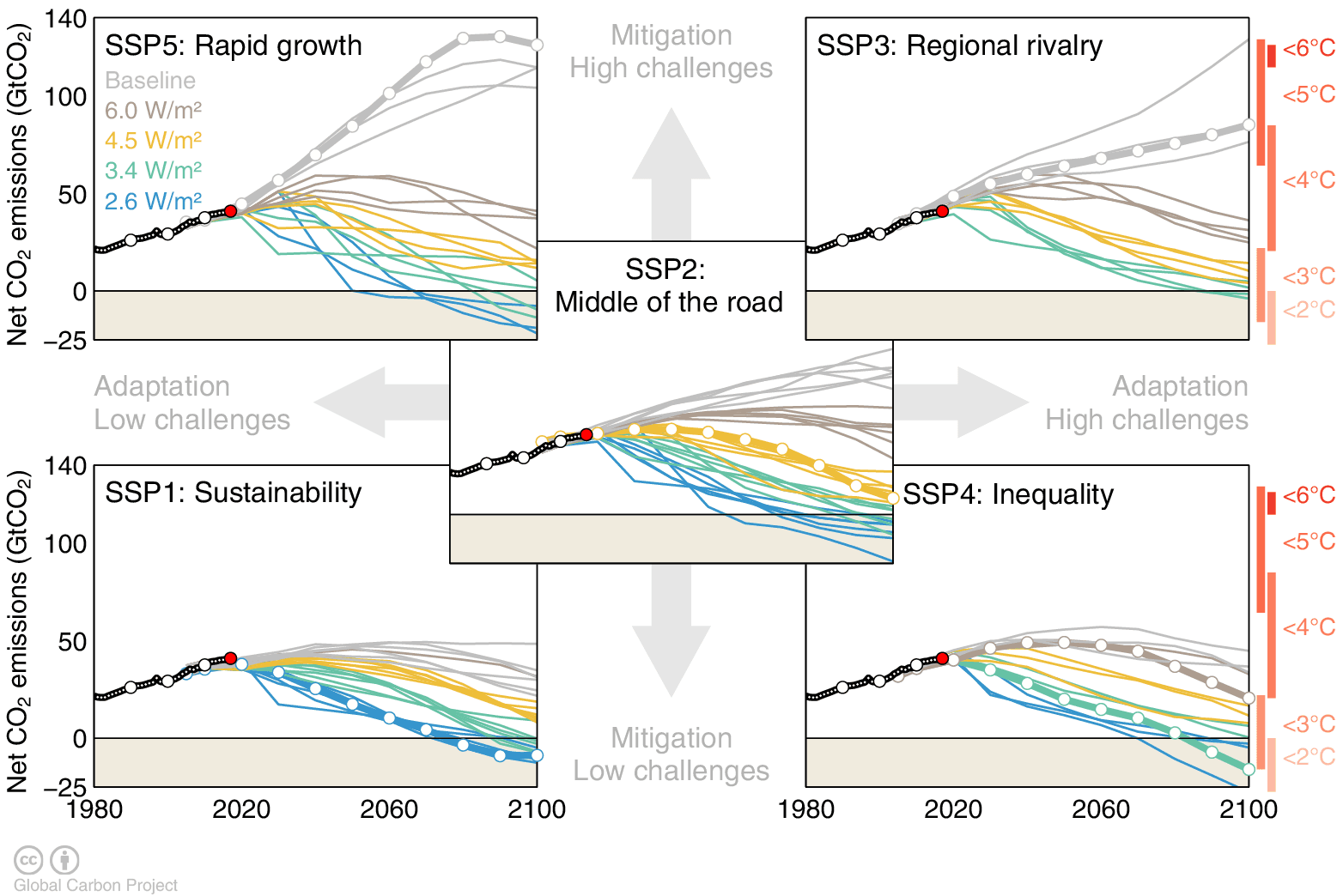 The figure shows "net emissions", which includes CO₂ emissions from fossil fuel combustion, cement, net land-use change, and carbon dioxide removal (generally bioenergy with carbon capture and storage). The bold scenarios in each case (with white markers), are known as "marker scenarios", that will be analysed further with complex climate models.