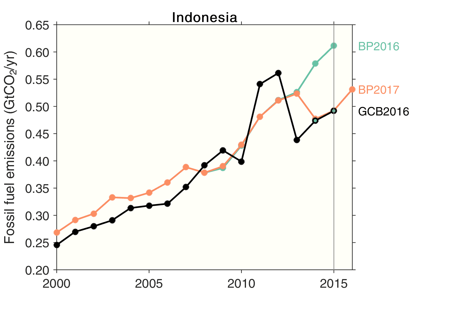 In this year’s BP data release, there was a rather drastic change in Indonesian coal consumption, hence emissions. The Global Carbon Budget (using CDIAC data) estimate of Indonesia emissions is also rather erratic.
