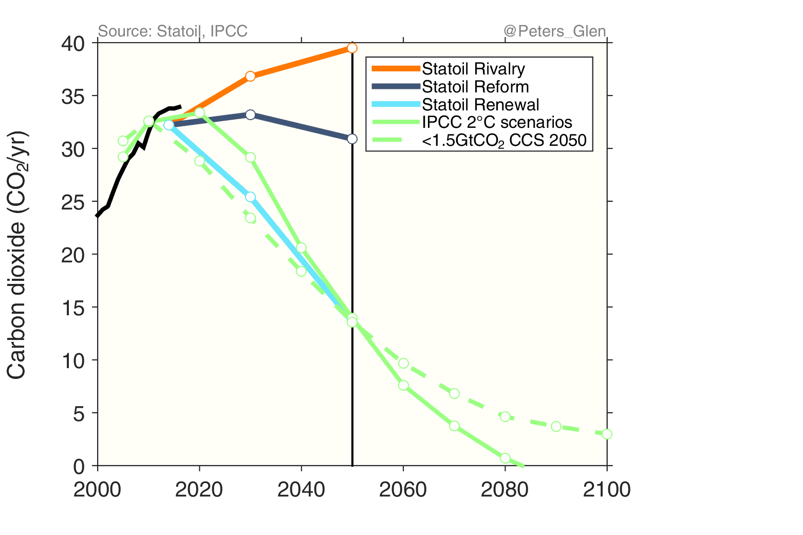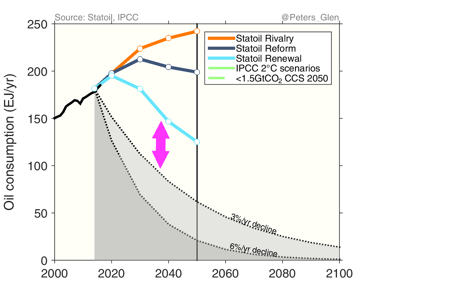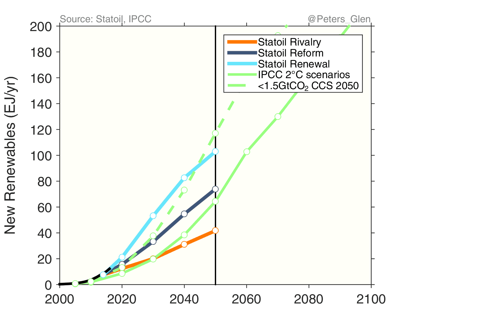 It is possible to overlay the Statoil figure with the latest generation of scenarios from the IPCC Fifth Assessment Report. I have shown the median of the 250 or so scenarios that give a 50-66% probability of staying below 2°C, most comparable to Statoil’s Renewal scenario (& IEA’s 450 scenario). Other choices could be made (many favour a >66% probability), but I want to make a consistent comparison and not squabble about probabilities.