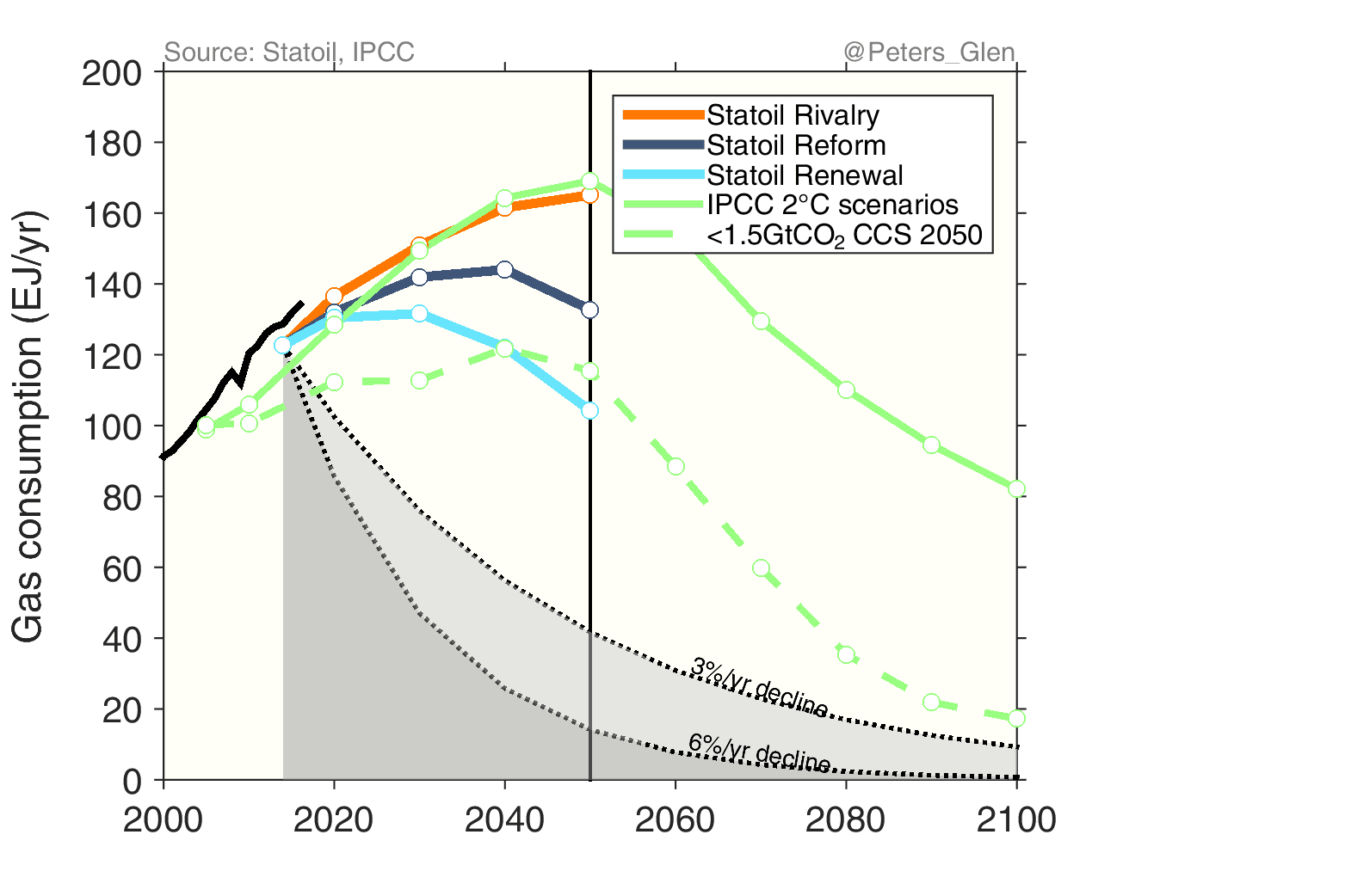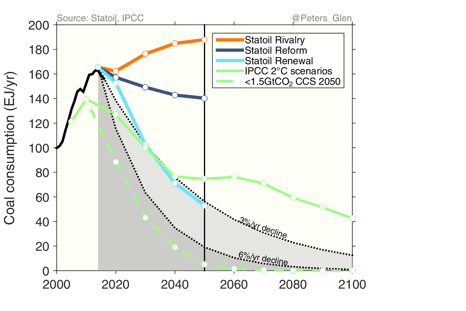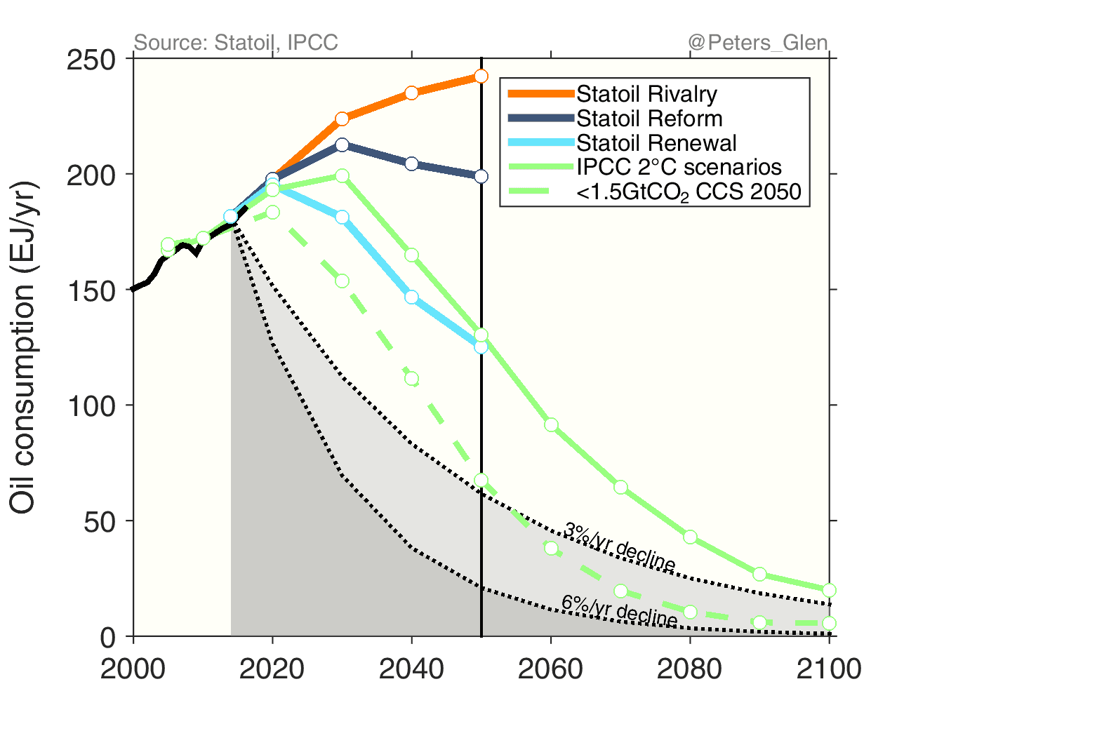 It is possible to overlay the Statoil figure with the latest generation of scenarios from the IPCC Fifth Assessment Report. I have shown the median of the 250 or so scenarios that give a 50-66% probability of staying below 2°C, most comparable to Statoil’s Renewal scenario (& IEA’s 450 scenario). Other choices could be made (many favour a >66% probability), but I want to make a consistent comparison and not squabble about probabilities.