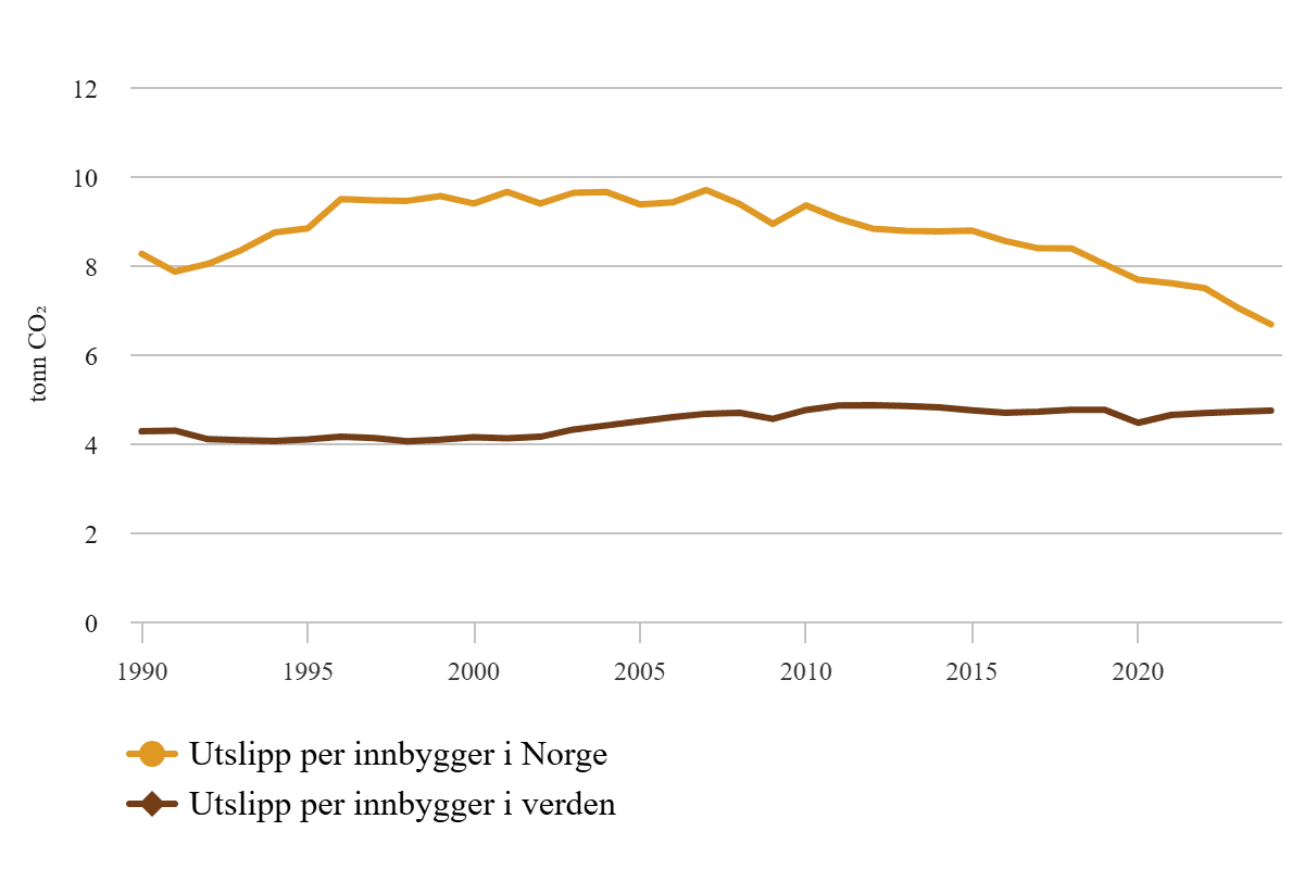 CO2-utslipp per person i Norge to tonn over snittet i verden