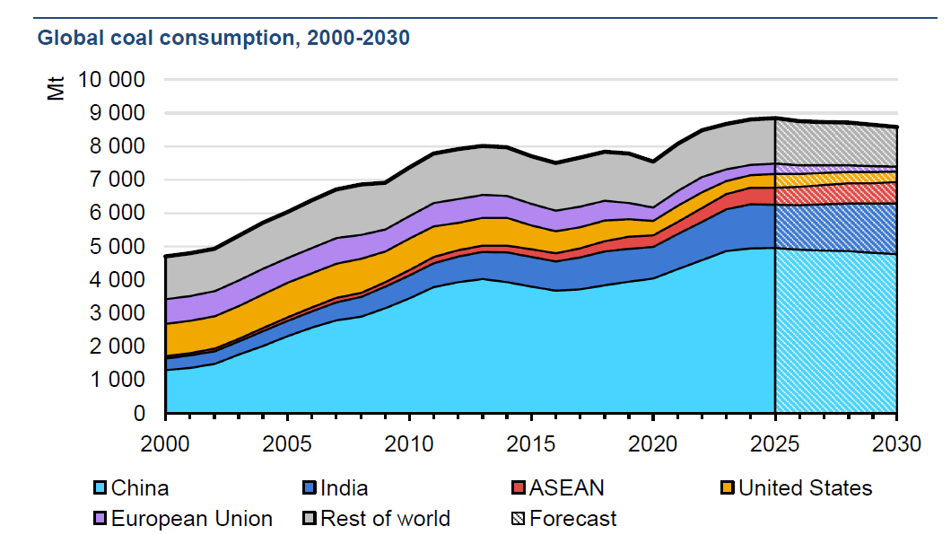 Globalt forbruk av kull 2000-2025, og prognose for årene til 2030. (Kilde: IEA)