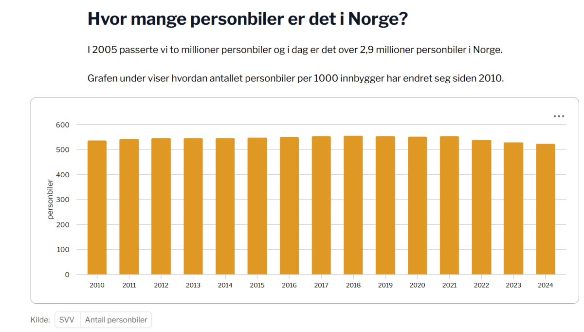 I Norge er det 525 personbiler per 1000 personer. Men Vestland ligger under snittet, og Oslo godt under snittet.