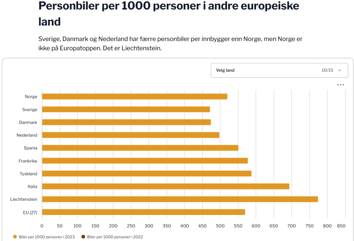 Biltettheten i Norge er litt høyere enn våre naboland i Nord-Europa, men vesentlig lavere enn i Italia. I Italia er det nesten 700 biler per 1000 innbyggere, altså vesentlig flere enn i Innlandet fylke. Aller øverst på Europatoppen er den rike lilleputtstaten Lichtenstein.