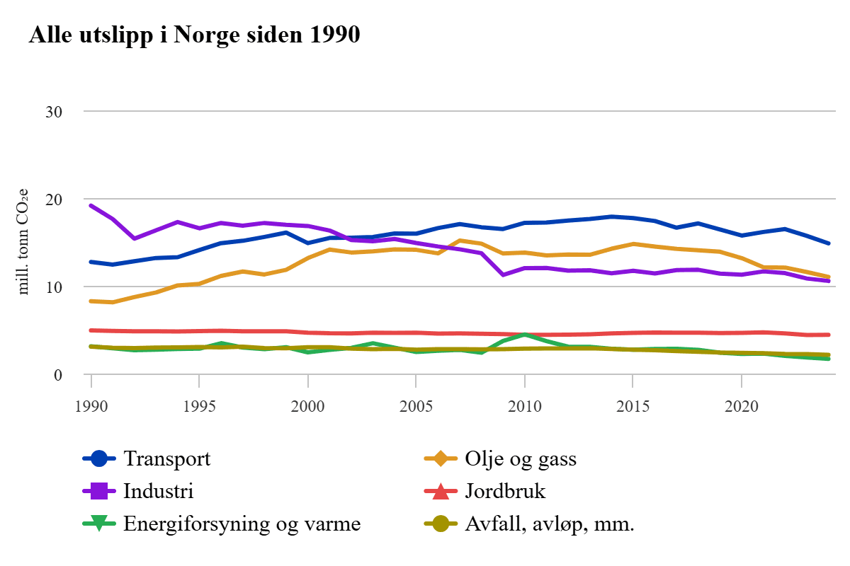 Norges klimagassutslipp 12,8 prosent lavere enn i 1990