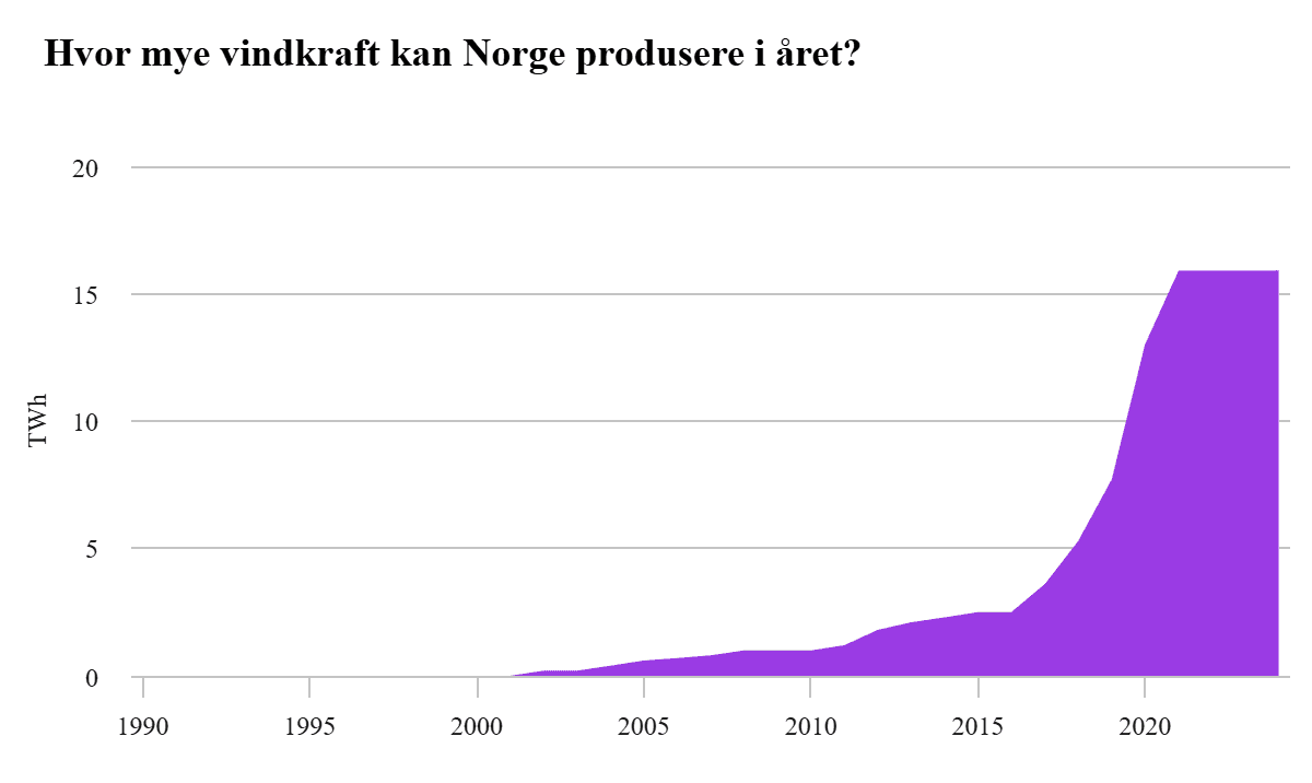 Det er totalt 64 vindkraftverk i Norge som til sammen produsere 15, 9 TWh. Det største, Øyfjellet vindkraftverk i Nordland, står får 1,3 TWh av produksjonen.