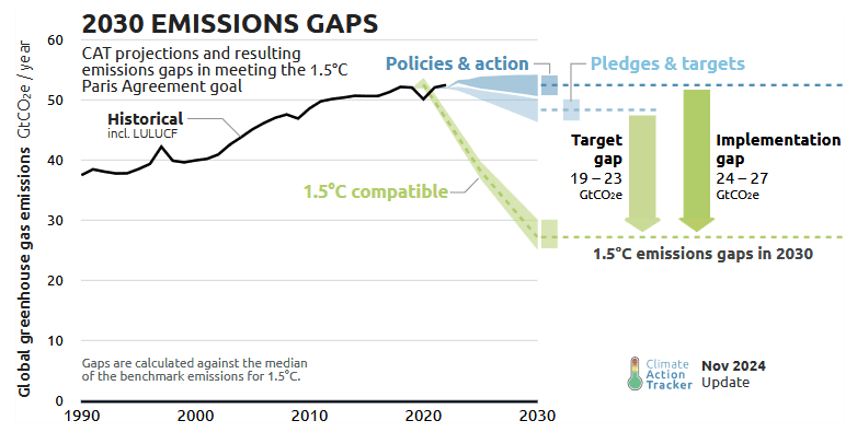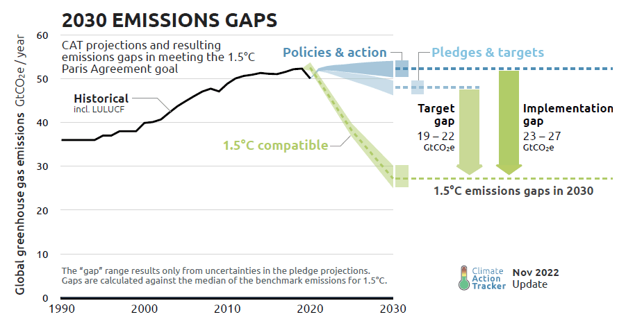 Analysebyrået Climate Action Tracker lager jevnlig en oversikt over gapet mellom løftene landene har gitt under Paris-avtalen, og hvor store og raske utslippskutt som må til for å klare klimamålene.