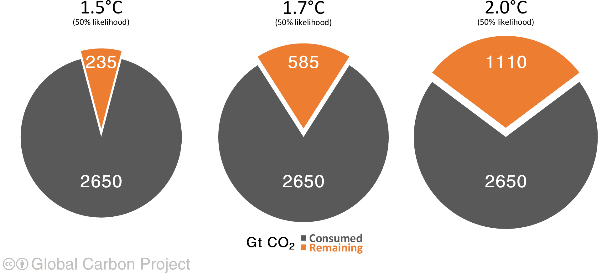 Forskerne i Global Carbon Project konkluderer med at det fra og med 2025 kan slippes ut omtrent 170 milliarder tonn CO2 før budsjettet for 1,5 grader er oppbrukt (med minst 50 prosents sannsynlighet). For 2 grader «gjenstår» det 1055 gigatonn CO2.