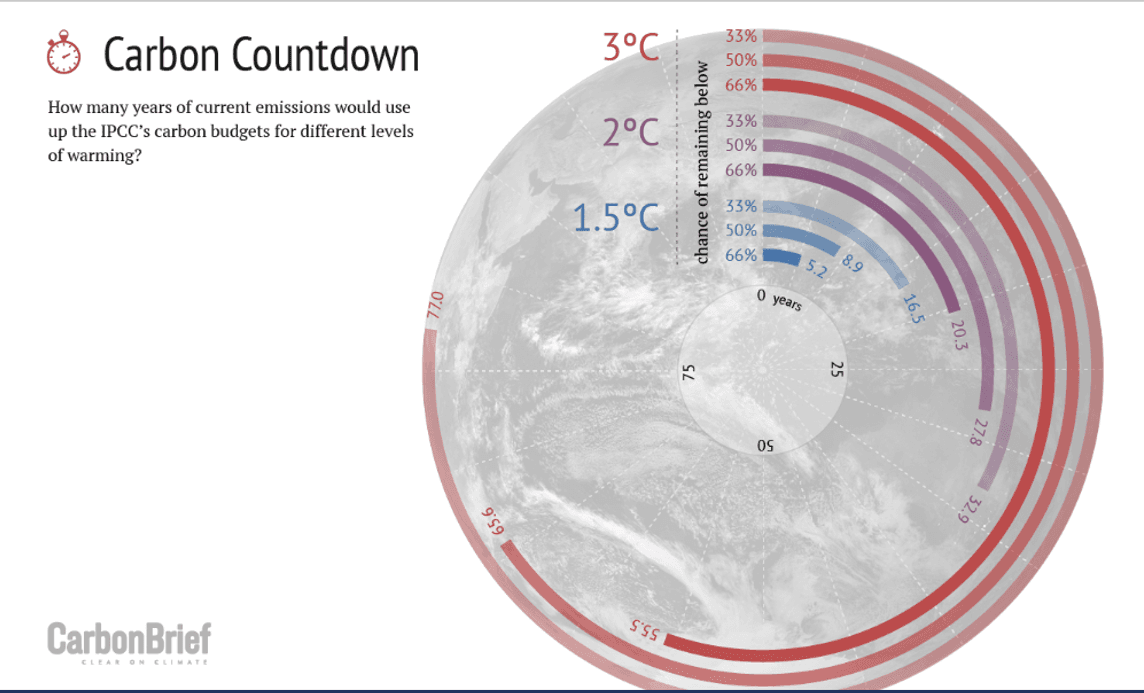Karbonbudsjettene fra FNs klimapanel forteller oss om sammenhengen mellom totale utslipp og den ventede temperaturøkningen. Et blikk på det gjenværende karbonbudsjettet gir en dyster fortelling. Paris-avtalen setter mål om at oppvarmingen skal begrenses til 1,5 grader, altså en skjerping i forhold til togradersmålet. Med dagens utslippsnivå vil det gå bare ni år før atmosfæren er tilført så mye CO₂ at det er 50 prosent sjanse til at det stopper på 1,5 grader. Tilsvarende har vi 20 år på oss for at vi med 66 prosents sannsynlighet kan stoppe på 2 grader, og 28 år på at togradersmålet kan oppfylles med 50 prosent sannsynlighet.