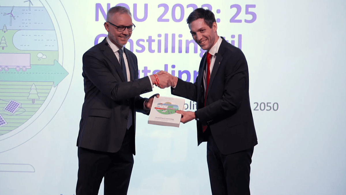 Utvalgsleder Martin Skancke overrakte rapporten fra Klimautvalget 2050 til klima- og miljøminister Andreas Bjelland Eriksen 24. oktober 2023. (Foto: regjeringen.no)