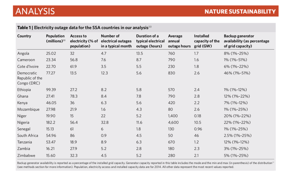 The magnitude of the challenge is well described in an article recently published in the journal Nature, "Sustainability implications of electricity outages in sub-Saharan Africa", by three researchers at the University of Pittsburgh, USA. The article shows that in Nigeria, Ghana, Tanzania, Angola, Kenya and most other countries in Sub-Saharan Africa emergency diesel generators represent grossly 10–20 percent of the country’s total power generating capacity. Between 500 and 1000 hours per year are typically lost in power outages, and even up to 5000 in Africa’s most populous and fast-growing country Nigeria. Users seek to mitigate the effect of power outages by increased use of diesel-generators. Power-outages therefore not only equal higher costs and lost revenues for businesses, and lost working time for students, health workers and others. It also translates into tens of thousands of infant deaths: Diesel generators is a main source of local particular pollution, estimated to have led to an additional 449,000 infant deaths in 2015 in Sub-Saharan Africa.