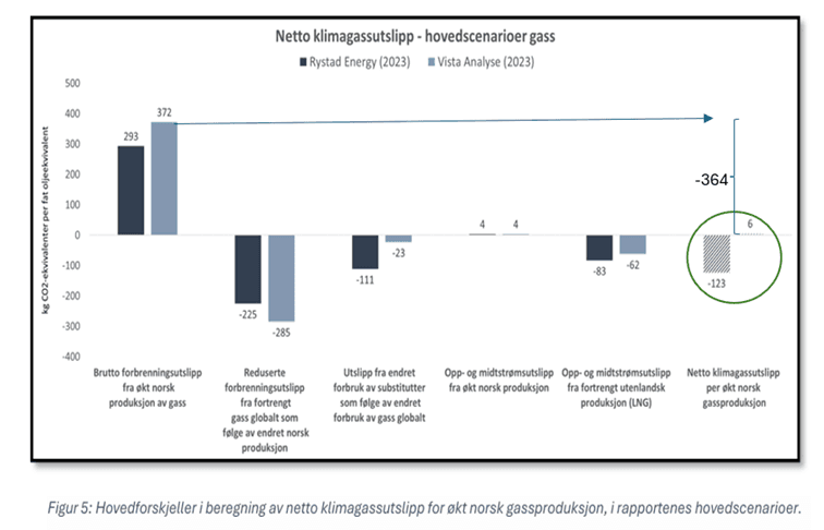 Den grønne sirkelen viser resultatet. Pilen viser at Vista har beregnet at nettoutslippene fra økt norsk produksjon av gass nesten når ned til null (6 kg CO₂e per fat oljeekvivalenter) fra 372 kg - på grunn av nytteeffekten av gassen. Rystad mener at det for gassens del er en viss positiv effekt, altså at nettoutslipp går ned når det produseres mer norsk gass (som her av tekniske grunner uttrykkes i minus).