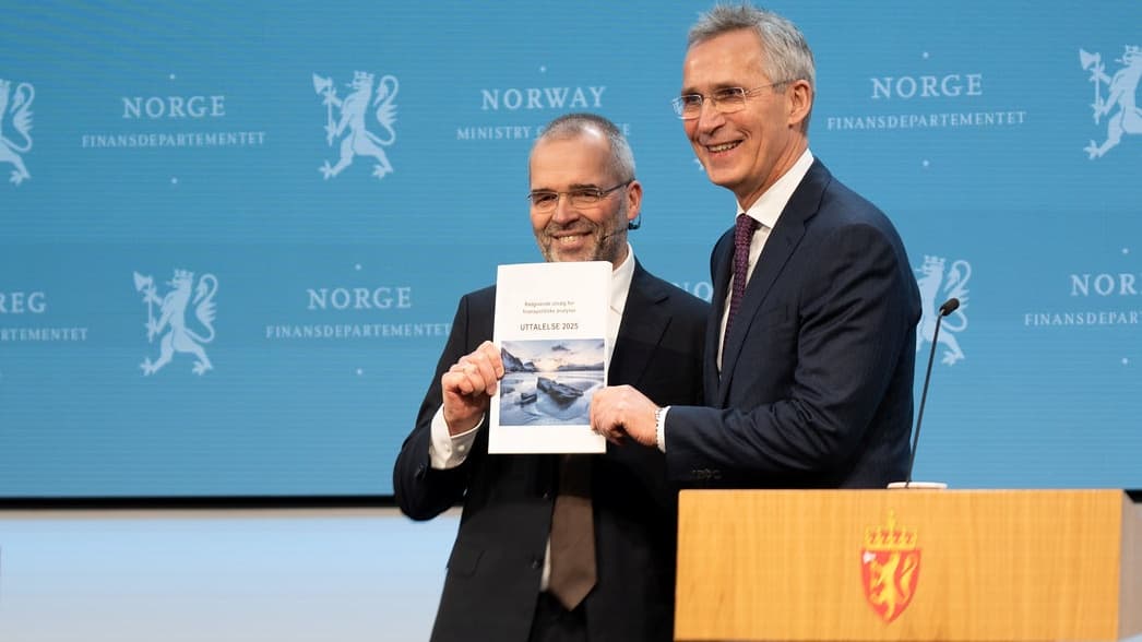 Gode råd er dyre? Professor Ragnar Torvik og finansminister Jens Stoltenberg ved presentasjonen av finanspolitikkutvalgets rapport 6. februar 2025. (Foto: Finansdepartementet)