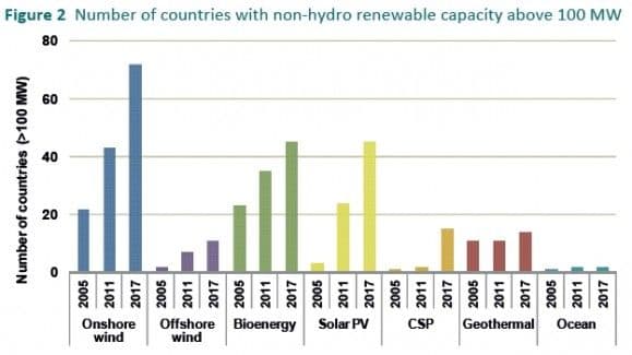 - Som vist i figuren nedenfor ligger det an til en kraftig økning i antall land med installert kapasitet på 100 megawatt (MW) innenfor de nye, fornybare teknologiene. Eksempelvis fordobles antallet land som i 2017 vil ha installert solcelle- og bioenergi på over 100 MW.